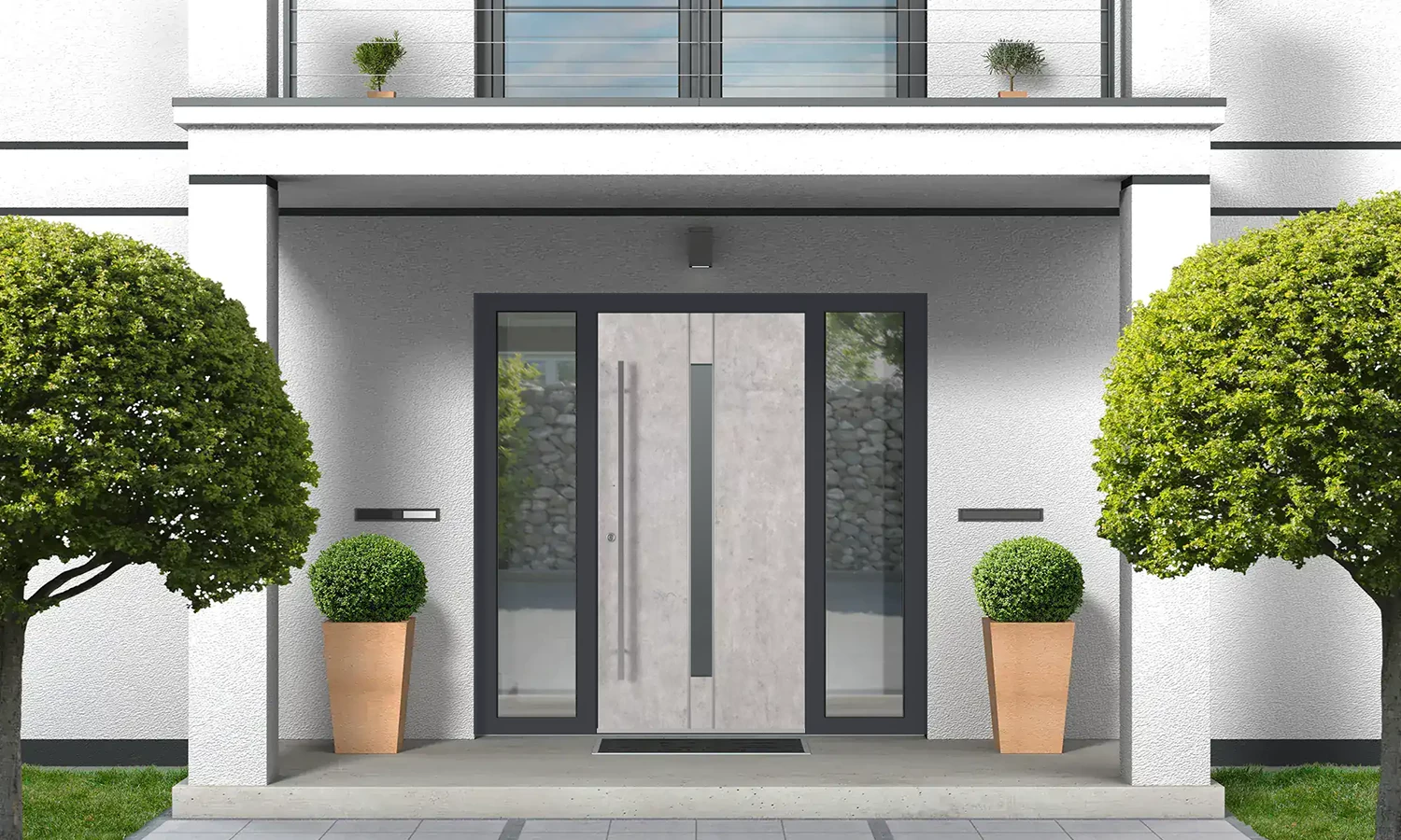 La porte modèle SK05 Beton 🏆 se distingue par son remplissage vitré, qui apporte de la lumière naturelle dans le bâtiment. Le côté extérieur de la porte est en quartz fritté. Le remplissage interne de la porte est constitué d'un panneau en aluminium. Ces portes ont des applications 3D en acier inoxydable qui leur donnent un look moderne.